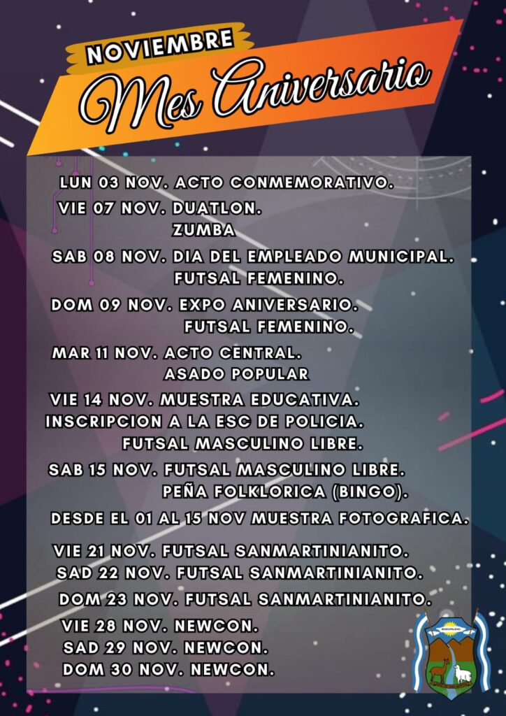 Este martes 11 de Noviembre la localidad de José de San Martín, estará celebrando un nuevo año de su fundación, con múltiples actividades que dieron inicio a principio de este mes, como ya es tradicional se realizará el acto central a partir de las 11 en el palco oficial emplazado en la plaza central, con la presencia de autoridades locales y provinciales, con un desfile cívico militar y la presencia de los vecinos que año a año acompañan en este importante acontecimiento, una vez finalizado el acto protocolar, los asistentes se trasladarán al predio de Jineteada Ricardo Hirigoyen donde degustarán el tradicional asado popular, con la presentación de artistas locales que amenizarán la celebración de un nuevo año